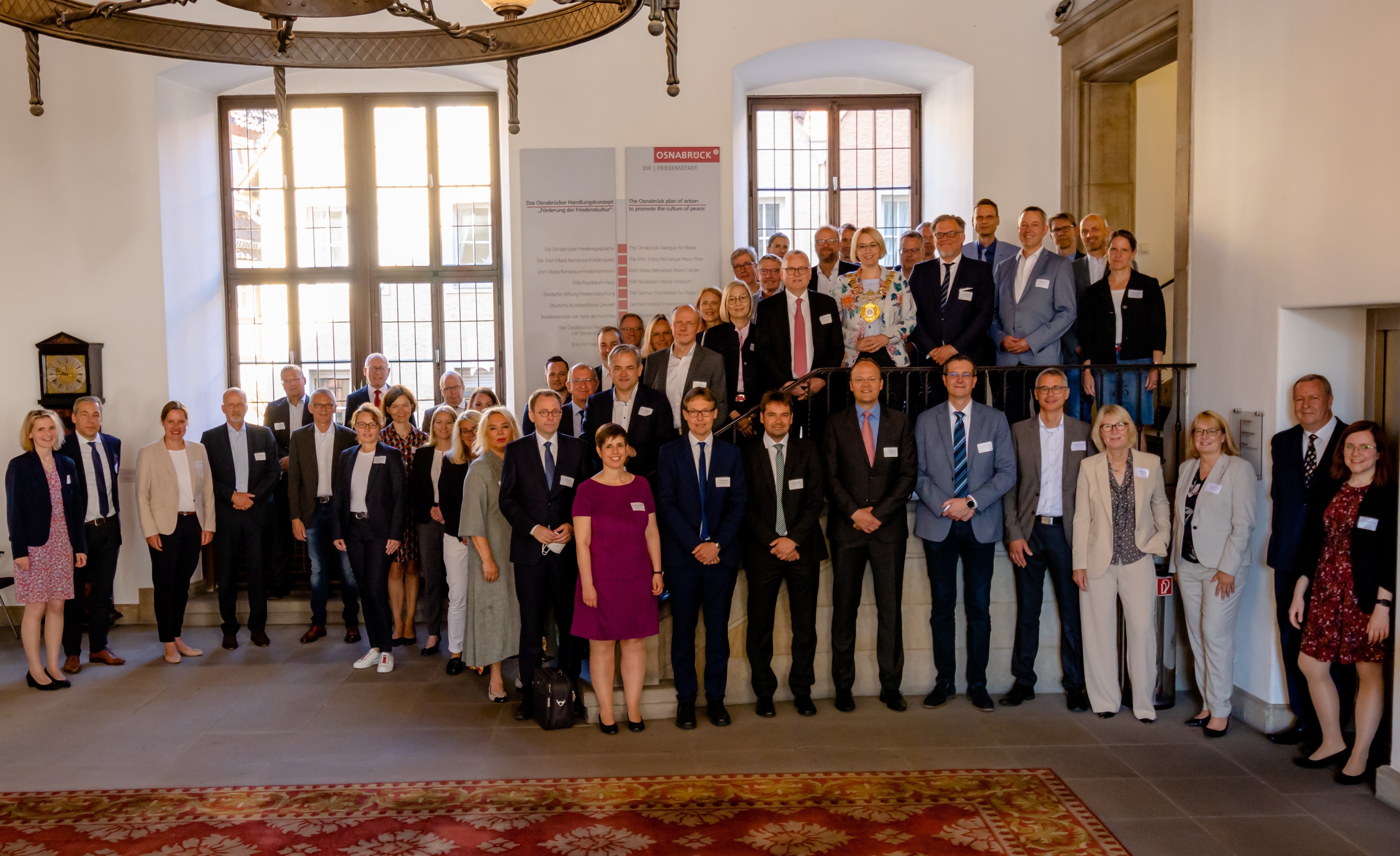 Am folgenden Mittwoch, den 22.06.2022, kamen sodann neben den Hausspitzen der Präsidialgerichte auch die Direktorinnen und Direktoren der weiteren 22 Amtsgerichte des Oberlandesgerichtsbezirks zusammen. Sie wurden von der Oberbürgermeisterin der Stadt Osnabrück, Frau Katharina Pötter, im Friedenssaal des Rathauses der Stadt empfangen.