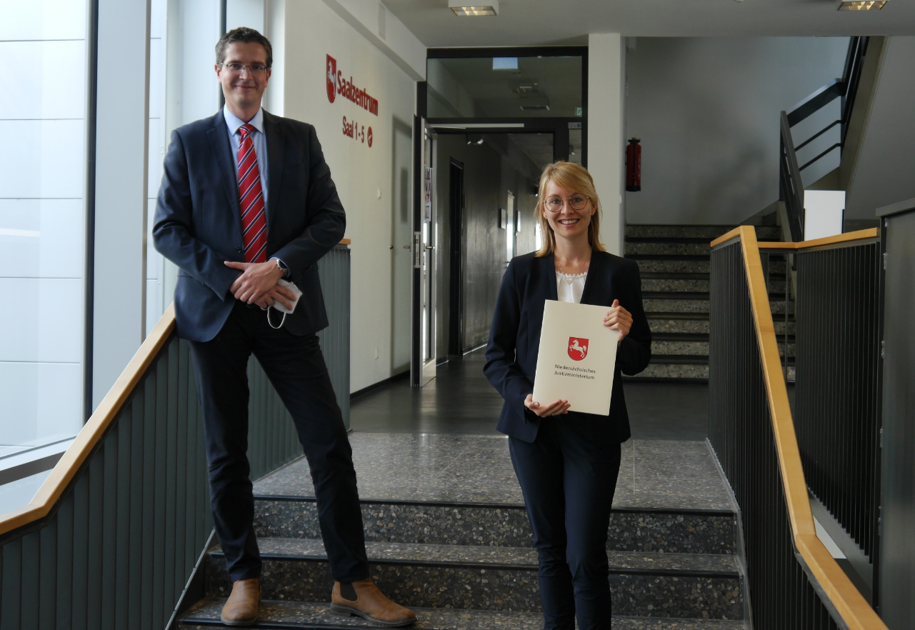 Osnabrück, 26.07.2021 Neue Familienrichterin am Amtsgericht Osnabrück ernannt Am 26.07.2021 wurde Wibke Sternitzke (im Bild rechts; links im Bild der Vizepräsident des Amtsgerichts Dr. Hune) zur Richterin (auf Lebenszeit) am Amtsgericht Osnabrück ernannt. Frau Sternitzke ist in Diepholz geboren und aufgewachsen im Landkreis Osnabrück. Im Anschluss an ihr Studium der Rechtswissenschaften in Osnabrück und Sevilla absolvierte sie ihr Referendariat im Bezirk des Oberlandesgerichts Oldenburg. Nach dem Eintritt in den höheren Justizdienst des Landes Niedersachsen als Richterin auf Probe folgten Stationen bei der Staatsanwaltschaft Osnabrück, dem Landgericht Oldenburg sowie den Amtsgerichten Jever und Meppen, ehe sie im März 2018 zum Amtsgericht Osnabrück wechselte. Hier bearbeitete sie zunächst ein Zivildezernat und verstärkt seit diesem Jahr die Familienabteilung. Wibke Sternitzke ist verheiratet und hat zwei Kinder. |