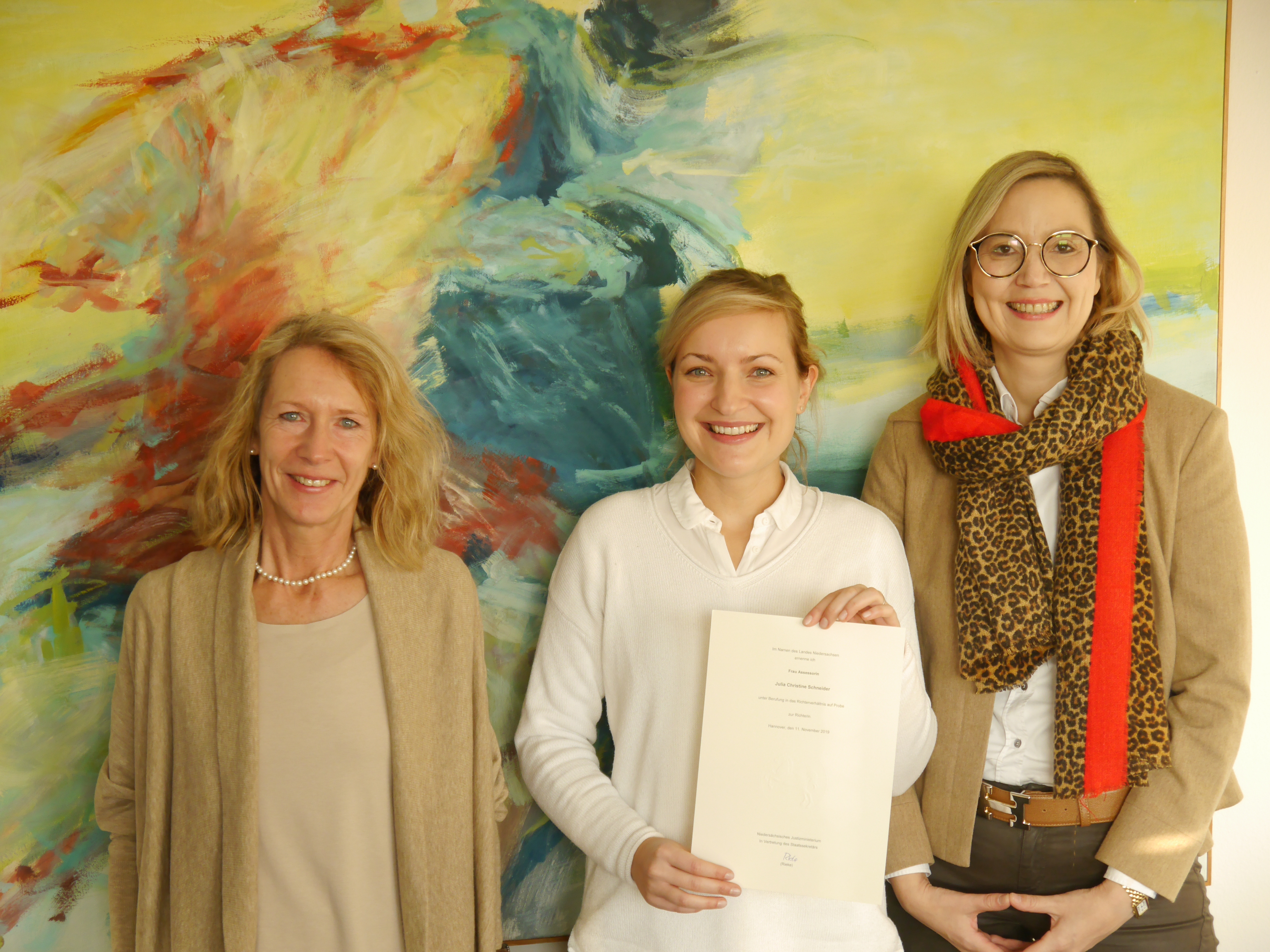 Am 04.12.2019 wurde Julia Schneider (Bildmitte) zur Richterin auf Probe in der Niedersächsischen Justiz ernannt und am Amtsgericht Osnabrück vereidigt.