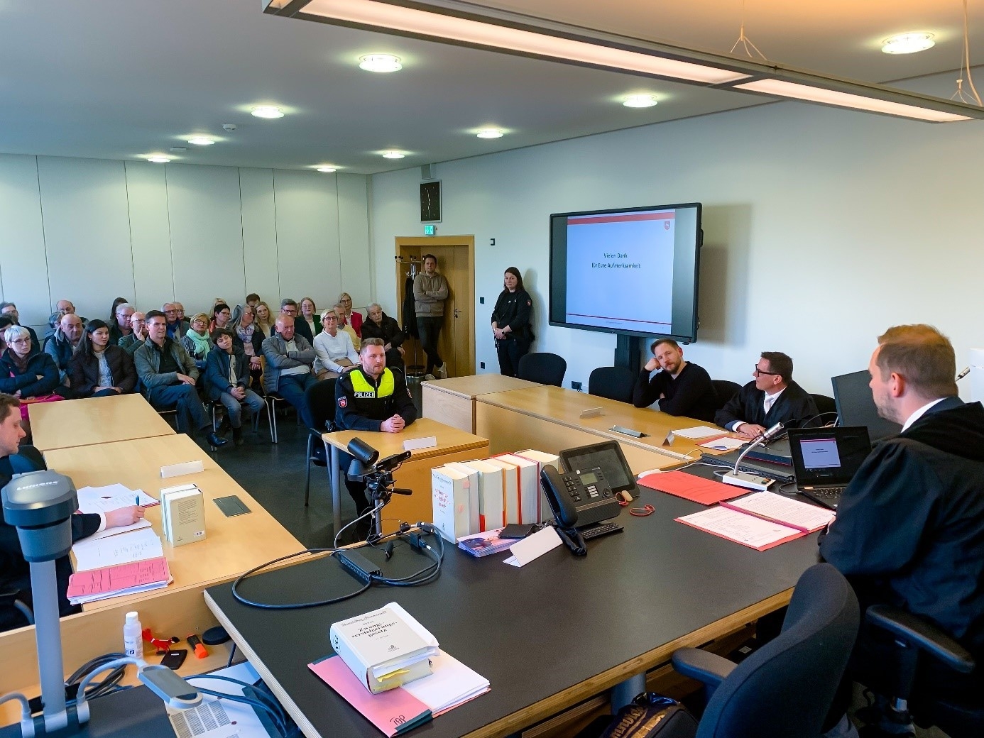 Danach hatten sich mehrere Mitarbeiterinnen und Mitarbeiter des Gerichts bereit erklärt, eine Strafverhandlung zu inszenieren und sich hierfür als Schauspieler zur Verfügung gestellt. Der Fall wurde einem echten Fall nachgebildet. Der Angeklagte soll demnach auf einem Bus getanzt und einen Freund gebeten haben, dies zu filmen, um das Video anschließend bei TikTok hochzuladen. Der Anklageschrift der Staatsanwaltschaft zufolge soll jedoch der Bus hierbei beschädigt worden sein. Nach der Tat soll der Angeklagte ferner geflüchtet sein und auf der Flucht noch eine Körperverletzung und eine Beleidigung begangen haben. Nach der Vernehmung mehrerer Zeugen – unter anderem eines Polizisten, die in ihrer Dienstkleidung erschien und allein hierdurch für Eindruck sorgte – wurden schließlich die Besucherinnen und Besucher sprichwörtlich an den Richtertisch gebeten und sollten selbst in die Rolle des Richters schlüpfen und durften überlegen, wie sie den Fall entschieden hätten. So konnte gut vermittelt werden, welche Verantwortung in der jeweiligen Richterhand liegt.