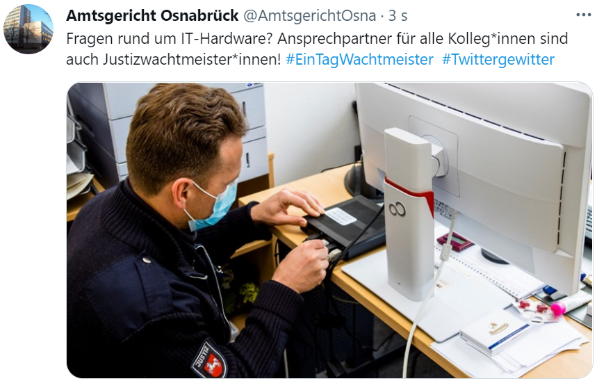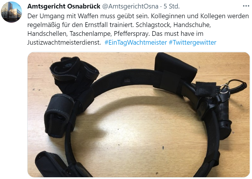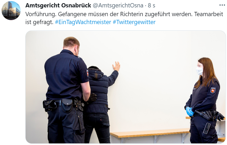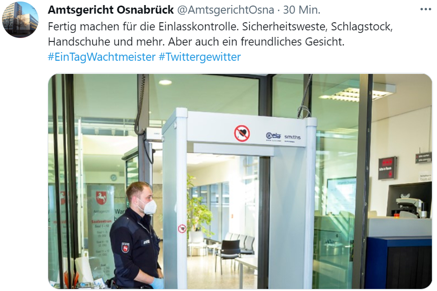 Sie selbst wollen Justizwachtmeisterin oder Justizwachtmeister werden? Dieses Berufsleben startet als Justizangestellte oder Justizangestellter im Wachtmeisterdienst. Idealerweise haben Sie eine abgeschlossene Berufsausbildung, sind körperlich fit, aufgeschlossen und bereit für die u.a. oben abgebildeten Tätigkeiten. Nach einer Erprobungszeit und einem mehrwöchigen Lehrgang nebst Prüfung stehen dann alle Möglichkeiten als Justizwachtmeisterin oder Justizwachtmeister offen. Das Landesjustizportal (www.justizportal.niedersachsen.de) hält weitere Berufsinformationen bereit. Bewerbungen sind in Niedersachsen an die jeweils örtlichen Gerichte zu übermitteln. Den am Amtsgericht Osnabrück zuständigen Kollegen können Sie unter Telefon 0541 315 2291 oder per E-Mail unter agos-poststelle@justiz.niedersachsen.de erreichen. Bewerbungen werde jederzeit, gerne auch per E-Mail, entgegengenommen. Falls sich eine Einstellungsmöglichkeit ergeben sollte, werden interessierte Kandidatinnen und Kandidaten zu einem Bewerbungsgespräch geladen.